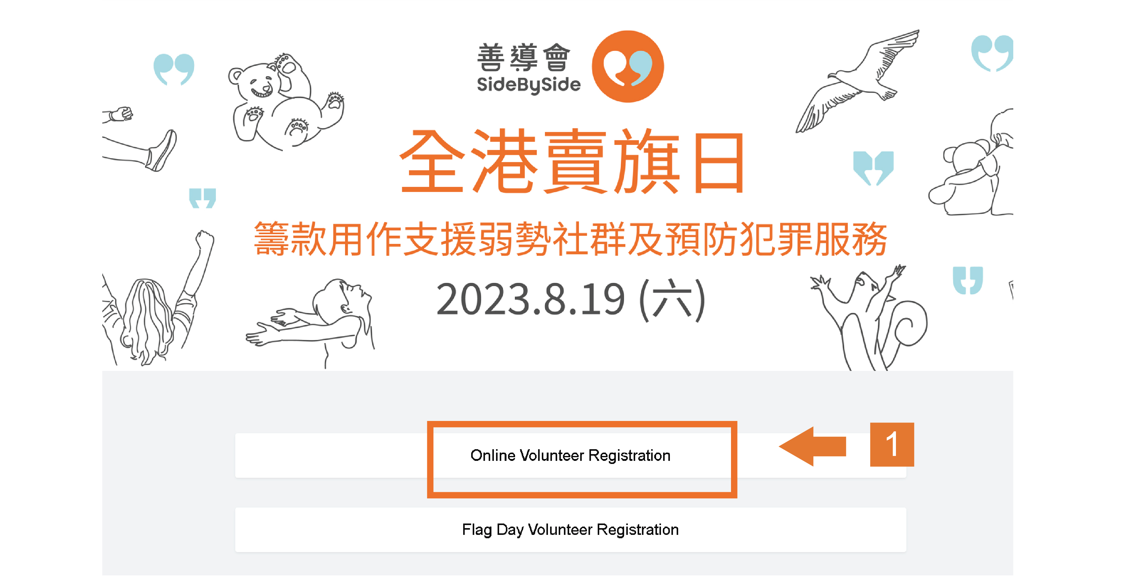 1. Please visit the SideBySide website for (https://flagday.sidebyside.org.hk) and select "Online Volunteer Registration" on the homepage.
