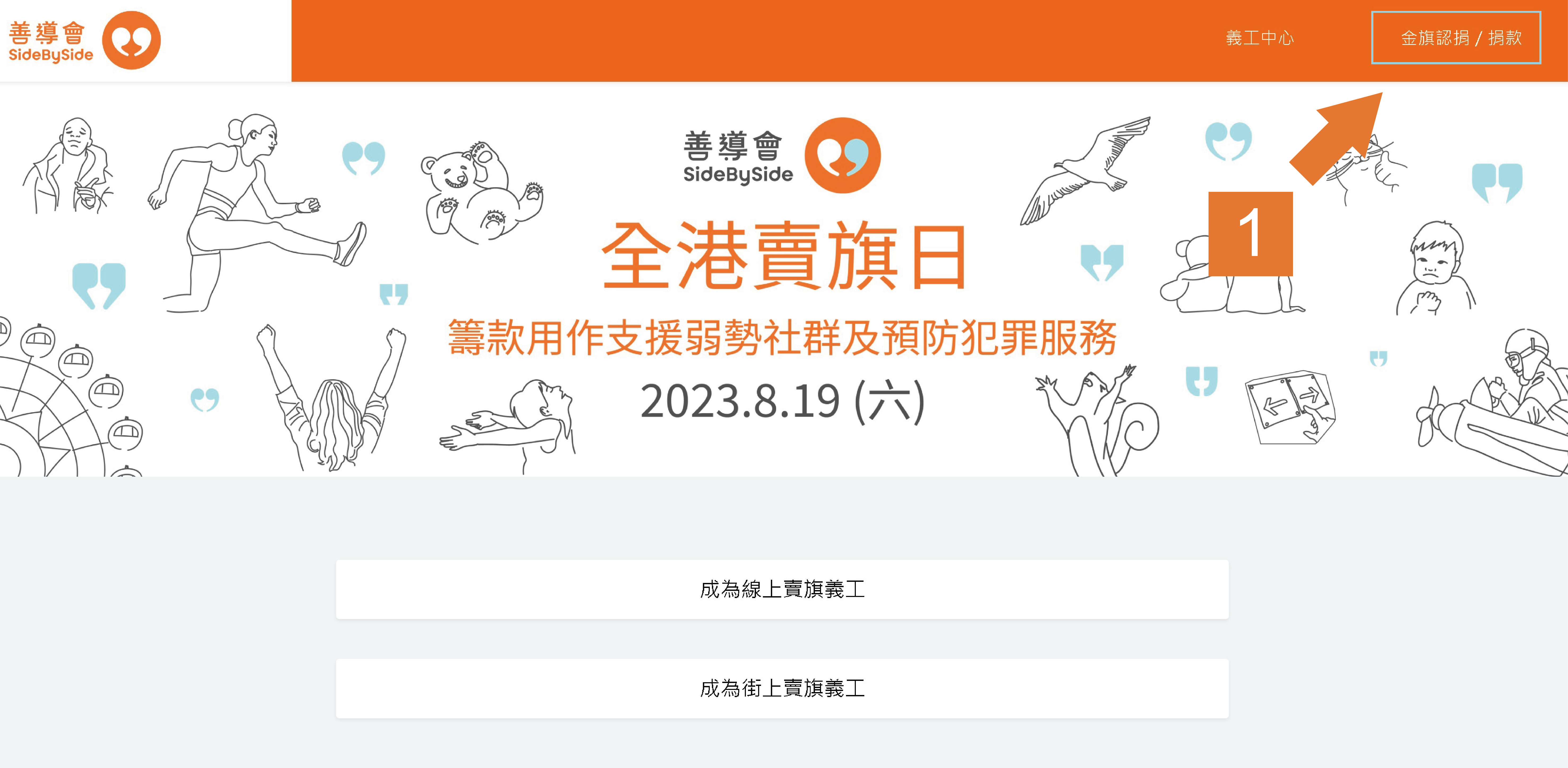 1. 前往善導會賣旗日網站 (https://flagday.sidebyside.org.hk)在主頁右上方選擇「金旗認捐/ 捐款」。