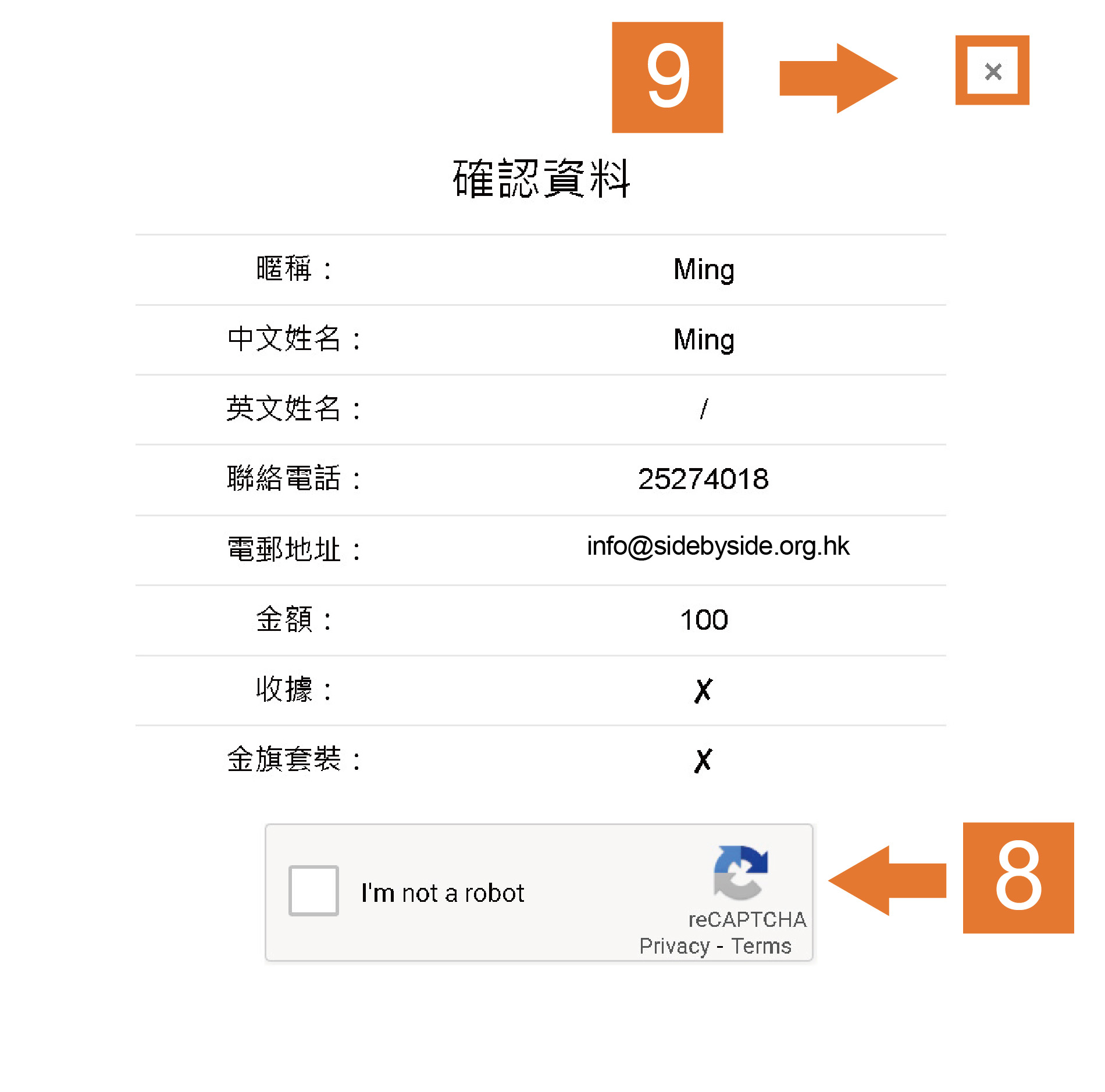 9) 如需要修改資料,點撃一下視窗右上角的「X」按鈕返回登記頁面。完成修改資料後,按上述步驟重新提交捐款便可。