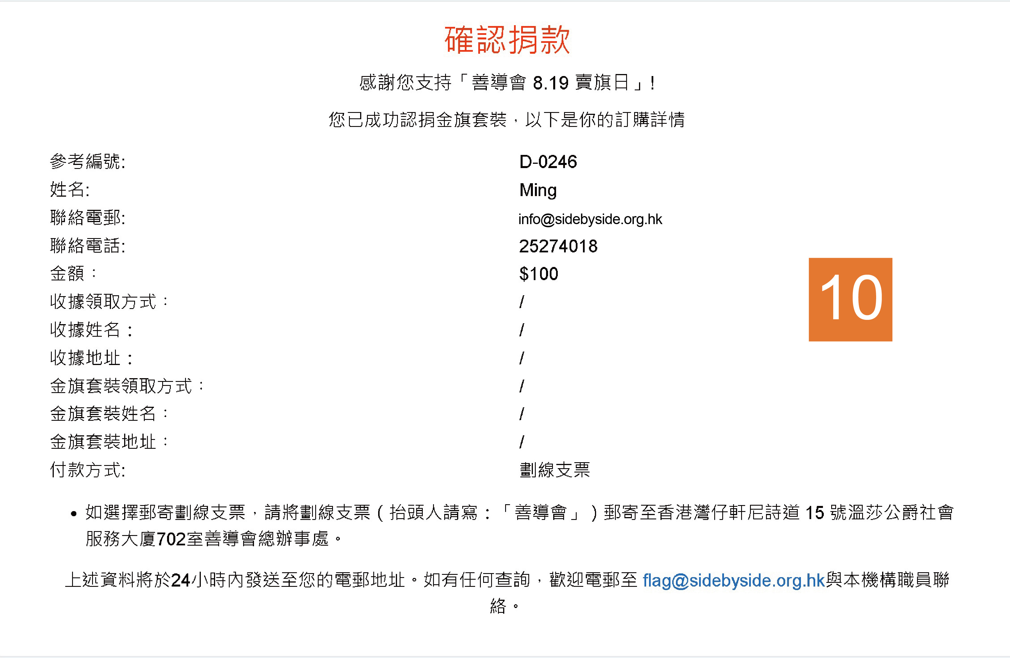 10) 完成捐款,你將會收到確認電郵。請留意: