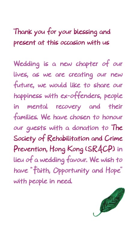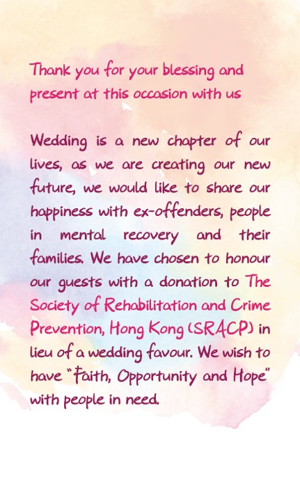 欢迎你将婚宴的回礼捐赠至香港善导会,在开展人生新的篇章之际,为有需要人士送上一份新的祝福,帮助服务使用者走出困局,重建新生。