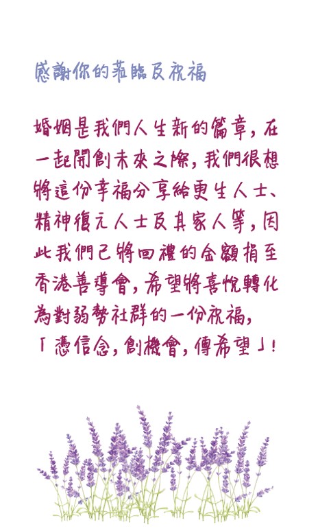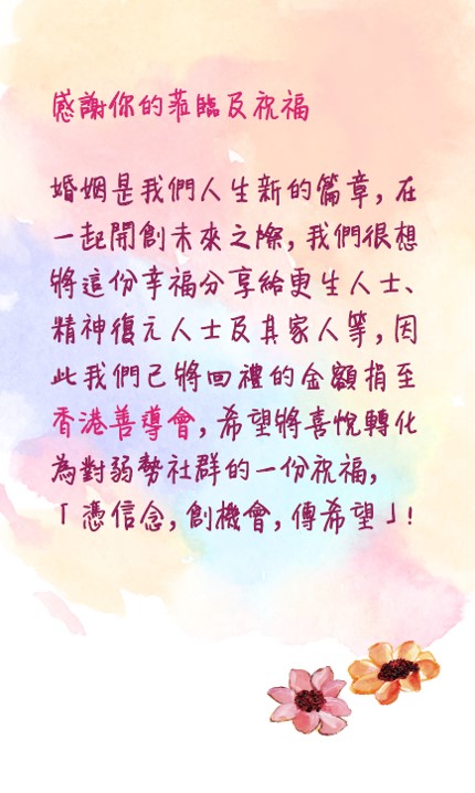 为表谢意,本会将为一对新人准备心意卡赠送给各位宾客,分享助人的喜悦。